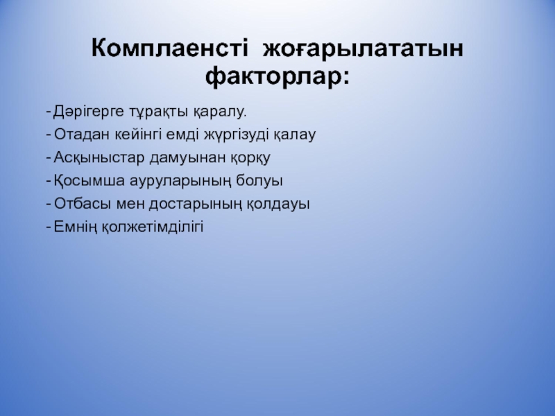 Слайд 11Комплаенсті жоғарылататын факторлар: