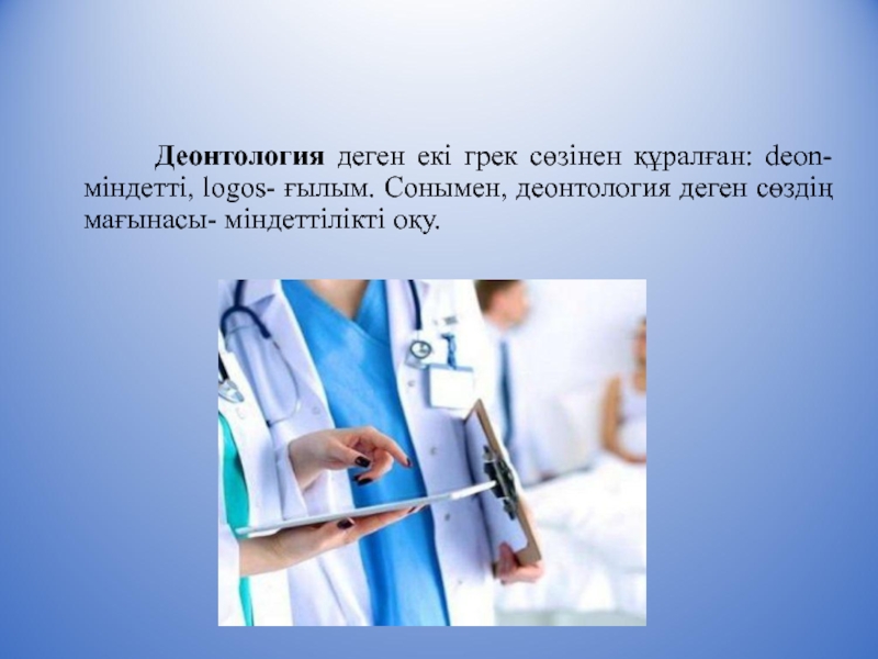 Слайд 4 Деонтология деген екі грек сөзінен құралған: deon- міндетті, logos- ғылым.