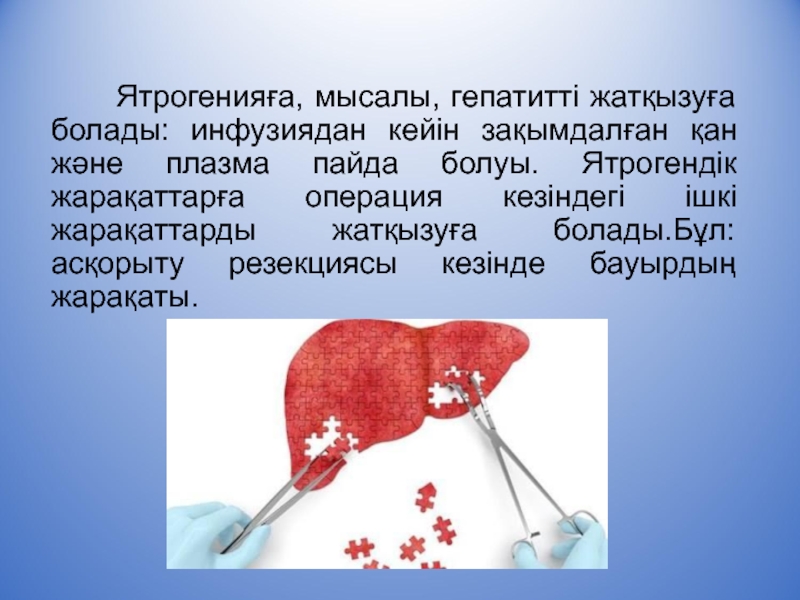 Слайд 14 Ятрогенияға, мысалы, гепатитті жатқызуға болады: инфузиядан кейін зақымдалған қан және