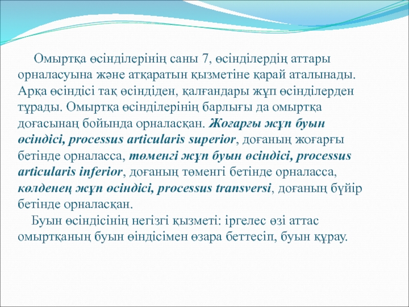 Слайд 8Омыртқа өсінділерінің саны 7, өсінділердің аттары орналасуына және атқаратын қызметіне
