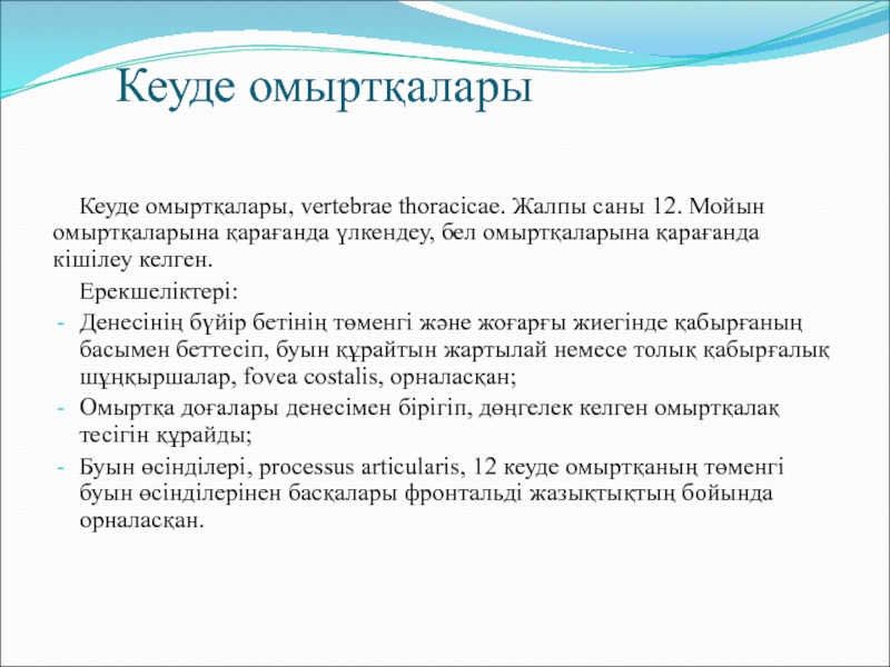 Кеуде омыртқалары, vertebrae thoracicae. Жалпы саны 12. Мойын омыртқаларына