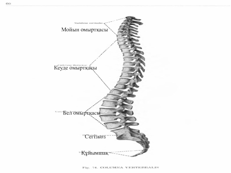 Омыртқа, vertebrae: денесінен, доғасынан және жеті өсіндісінен тұрады.