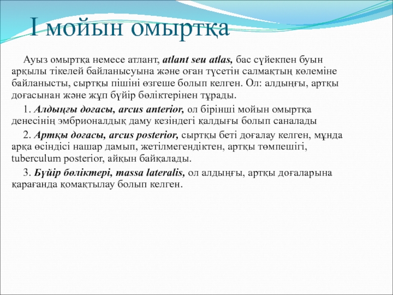 1. Алдыңғы доғасы, arcus anterior, ол бірінші мойын омыртқа денесінің эмбрионалдық даму кезіндегі қалдығы болып саналады