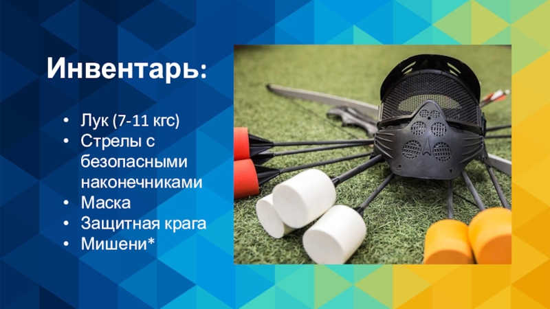 Инвентарь:Лук (7-11 кгс)Стрелы с безопасными наконечникамиМаскаЗащитная крагаМишени*
