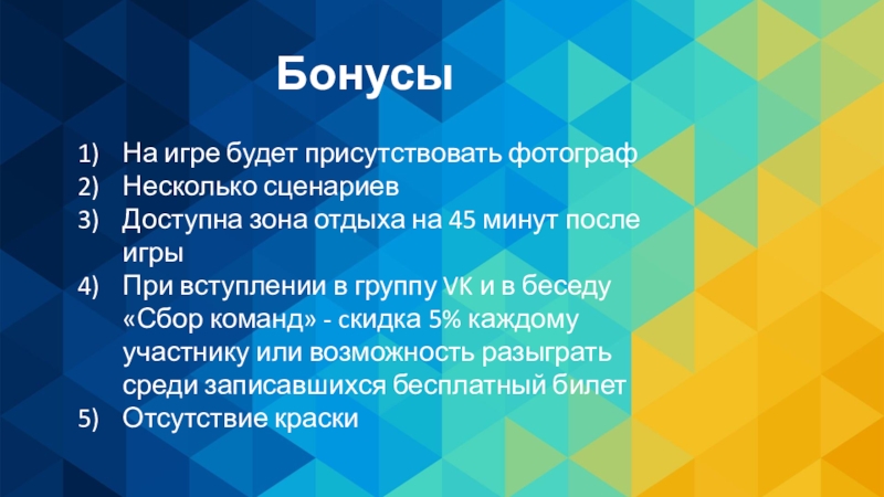 БонусыНа игре будет присутствовать фотографНесколько сценариевДоступна зона отдыха на 45 минут после игрыПри вступлении в группу VK