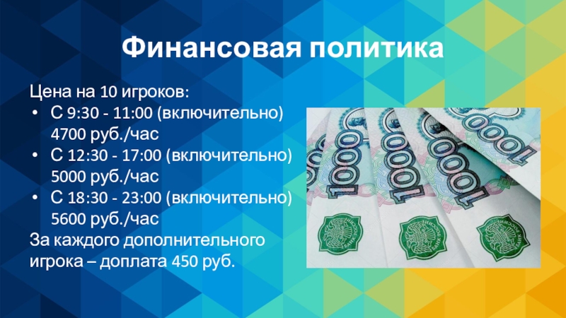 Финансовая политикаЦена на 10 игроков:С 9:30 - 11:00 (включительно) 4700 руб./часС 12:30 - 17:00 (включительно) 5000 руб./часС