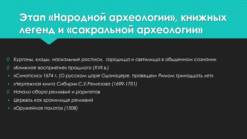 Слайд 5Этап «Народной археологии», книжных легенд и «сакральной археологии»