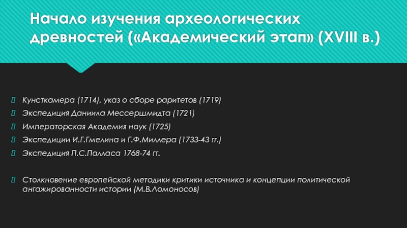 Начало изучения археологических древностей («Академический этап» (XVIII в.)Кунсткамера (1714), указ о сборе раритетов (1719)Экспедиция Даниила Мессершмидта (1721)Императорская