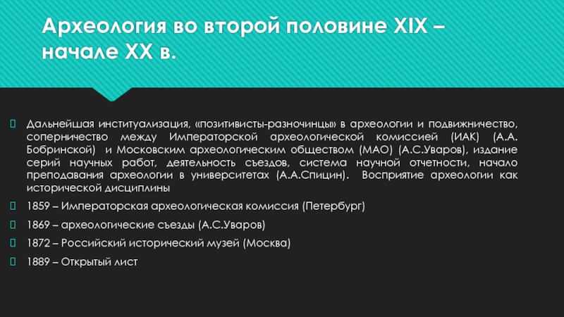(ИАК) (А.А.Бобринской) и Московским археологическим обществом (МАО) (А.С.Уваров), издание серий научных работ, деятельность съездов, система научной отчетности, начало преподавания археологии в университетах (А.А.Спицин). Восприятие археологии как исторической дисциплины