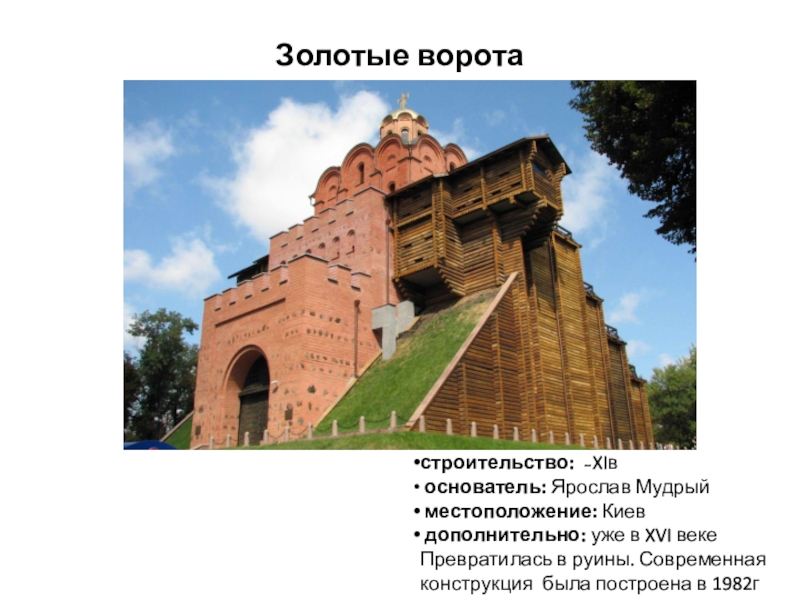 Золотые ворота строительство:  ̴ XIв основатель: Ярослав Мудрый местоположение: Киев дополнительно: уже в XVI векеПревратилась в