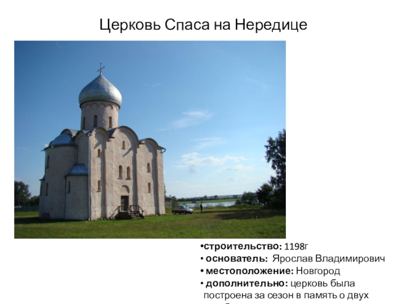 Церковь Спаса на Нередицестроительство: 1198г основатель:  Ярослав Владимирович местоположение: Новгород дополнительно: церковь была построена за сезон в