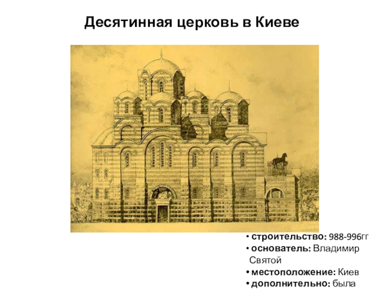 Десятинная церковь в Киеве строительство: 988-996гг основатель: Владимир Святой местоположение: Киев дополнительно: была разрушена монголами в 1240г.