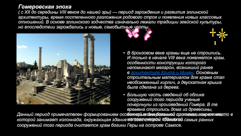 разложения родового строя и появления новых классовых отношений. В основе эллинского зодчества изначально лежали традиции эгейской культуры, но впоследствии зарождались и новые, самобытные черты.В бронзовом веке храмы еще не строились. И только в начале VIII века появляется храм, особенности конструкции которого напоминают мегарон, возникший ранее в архитектуре Крита и Микен. Основным строительным материалом для храма стал необожженный кирпич, а двускатная крыша была сделана из дерева.