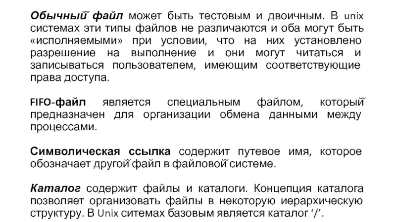 Слайд 4Обычный̆ файл может быть тестовым и двоичным. В unix системах