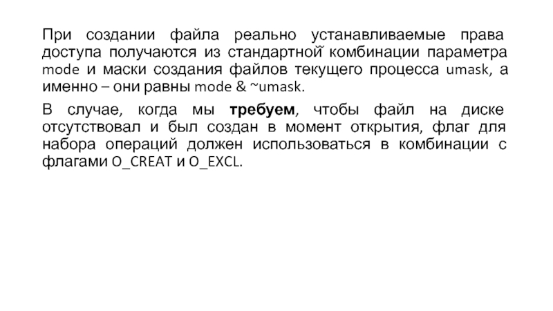 Слайд 13При создании файла реально устанавливаемые права доступа получаются из стандартной̆