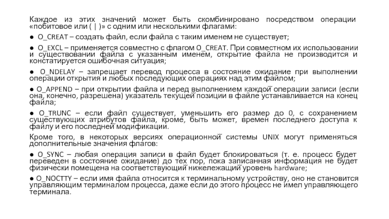 ● O_EXCL – применяется совместно с флагом O_CREAT. При совместном их использовании и существовании файла с указанным именем, открытие файла не производится и констатируется ошибочная ситуация;
