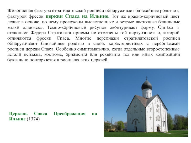 основе, по нему проложены высветленные и острые пастозные белильные мазки «движек». Темно-коричневый рисунок оконтуривает форму. Однако в стенописи Федора Стратилата приемы не отмечены той виртуозностью, которой отличаются фрески Спаса. Многие персонажи стратилатовской росписи обнаруживают ближайшее родство в своих харахтеристиках с персонажами росписи церкви Спаса. Особенно симптоматично, когда отдельные второстепенные детали пейзажа, костюма, орнамента или реквизита тех или иных композиций буквально повторяются в росписях этих церквей.