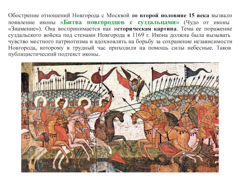 «Знамение»). Она воспринимается как историческая картина. Тема ее поражение суздальского войска под стенами Новгорода в 1169 г. Икона должна была вызывать чувство местного патриотизма и вдохновлять на борьбу за сохранение независимости Новгорода, которому в трудный час приходили на помощь силы небесные. Таков публицистический подтекст иконы.