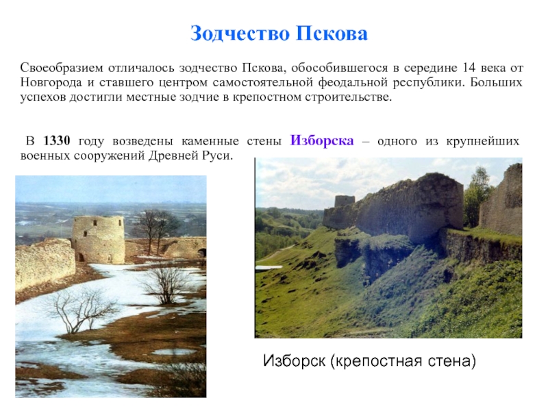В 1330 году возведены каменные стены Изборска – одного из крупнейших военных сооружений Древней Руси.