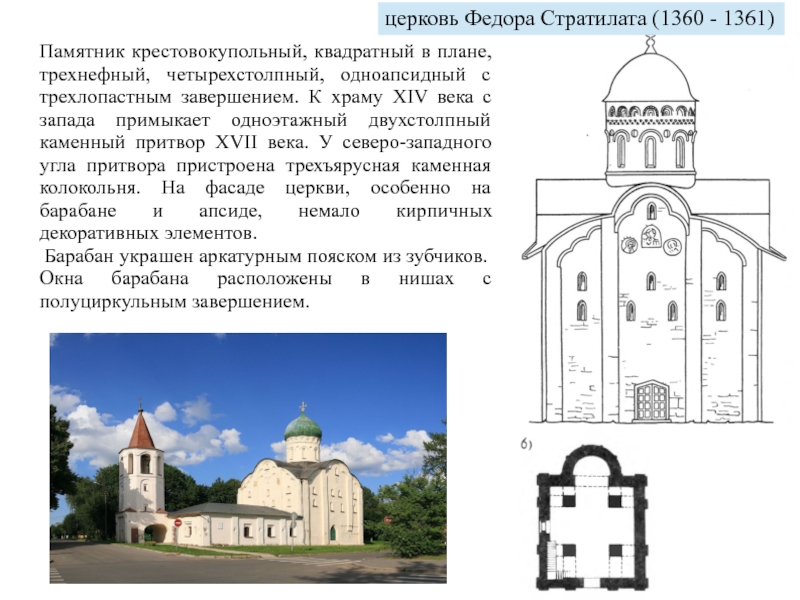Слайд 7Памятник крестовокупольный, квадратный в плане, трехнефный, четырехстолпный, одноапсидный с трехлопастным