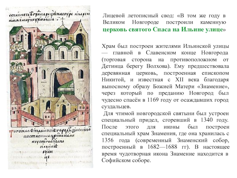 жителями Ильинской улицы — главной в Славенском конце Новгорода (торговая сторона на противоположном от Детинца берегу Волхова). Ему предшествовала деревянная церковь, построенная епископом Никитой, и известная с XII века благодаря выносному образу Божией Матери «Знамение», через который по преданию Новгород был чудесно спасён в 1169 году от осаждавших город суздальцев.