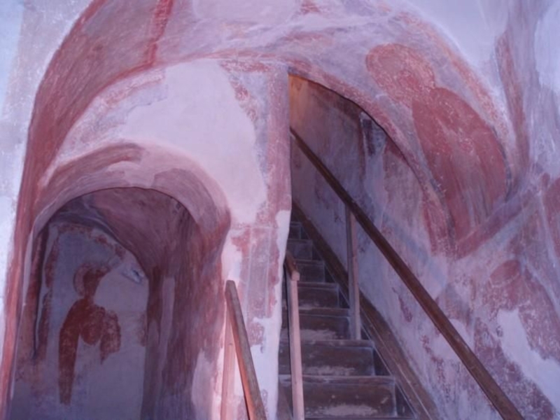 каменный притвор XVII века. У северо-западного угла притвора пристроена трехъярусная каменная колокольня. На фасаде церкви, особенно на барабане и апсиде, немало кирпичных декоративных элементов.