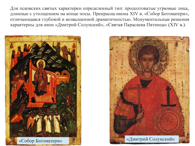 Богоматери», отличающаяся глубокой и возвышенной драматичностью. Монументальные решения характерны для икон «Дмитрий Солунский», «Святая Параскева Пятница» (XIV в.).
