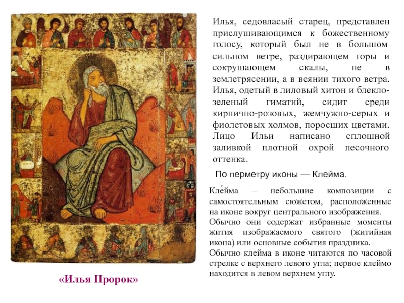 скалы, не в землетрясении, а в веянии тихого ветра. Илья, одетый в лиловый хитон и блекло-зеленый гиматий, сидит среди кирпично-розовых, жемчужно-серых и фиолетовых холмов, поросших цветами. Лицо Ильи написано сплошной заливкой плотной охрой песочного оттенка.