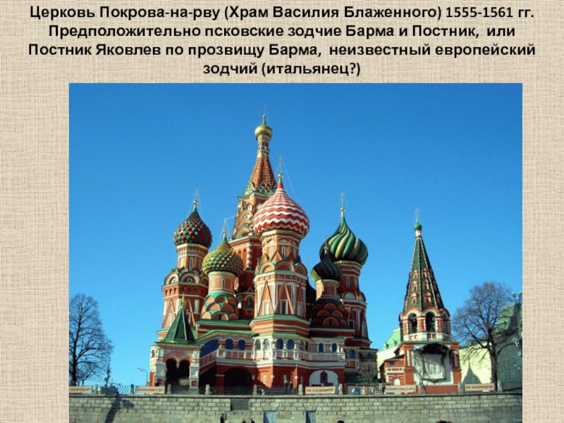 Церковь Покрова-на-рву (Храм Василия Блаженного) 1555-1561 гг.Предположительно псковские зодчие Барма и Постник, или Постник Яковлев по прозвищу
