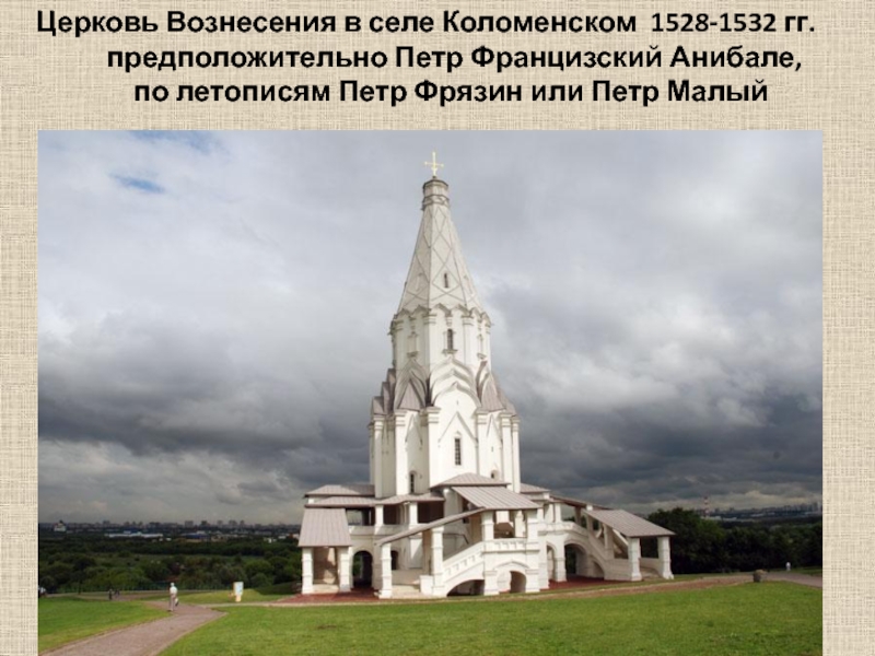 Церковь Вознесения в селе Коломенском 1528-1532 гг. предположительно Петр Францизский Анибале, по летописям Петр Фрязин или Петр