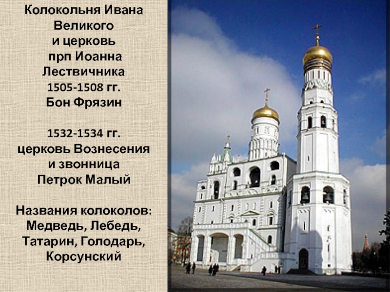 Колокольня Ивана Великогои церковь прп Иоанна Лествичника1505-1508 гг.Бон Фрязин1532-1534 гг. церковь Вознесения и звонницаПетрок МалыйНазвания колоколов:Медведь, Лебедь,