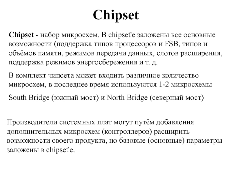 Chipset - набор микросхем. В chipset'е заложены все основные возможности