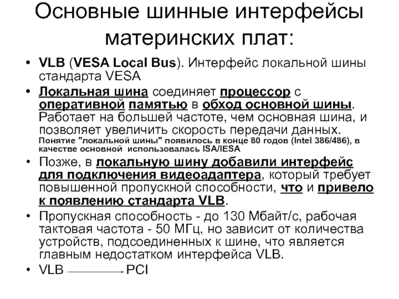 Пропускная способность - до 130 Мбайт/с, рабочая тактовая частота - 50 МГц, но зависит от количества устройств, подсоединенных к шине, что является главным недостатком интерфейса VLB.