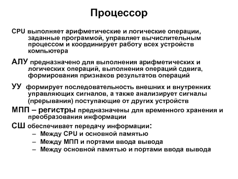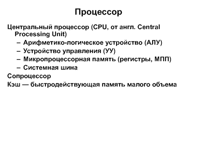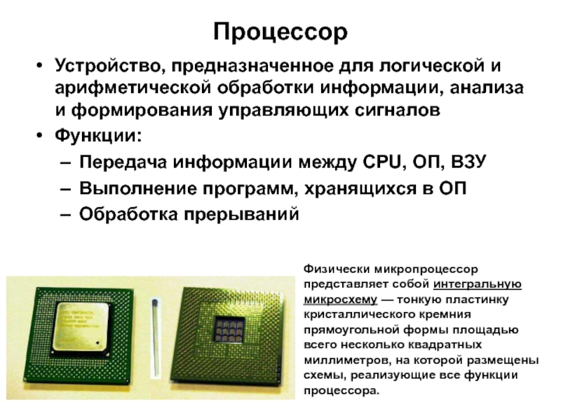Процессор – одно или несколько устройств, осуществляющих логическую и арифметическую обработку информации. Процессор выполняет программы, обеспечивая тем самым обработку данных