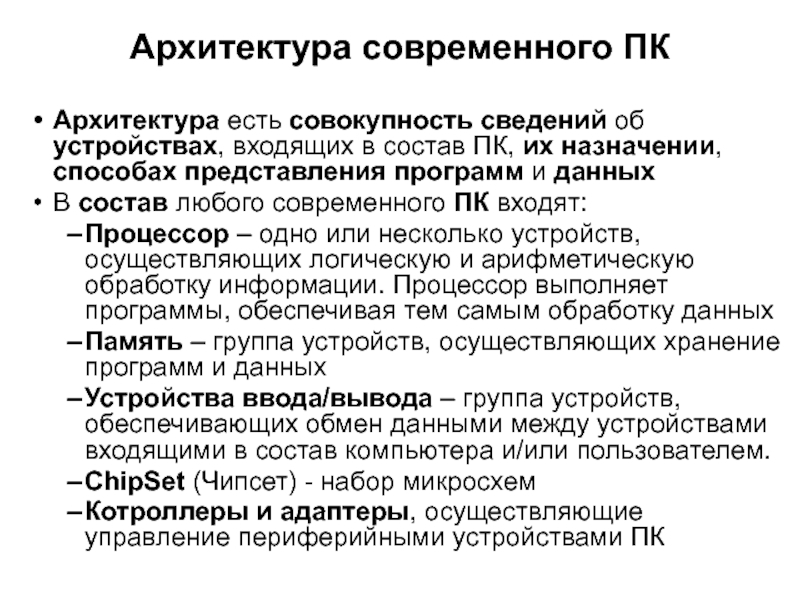 Архитектура есть совокупность сведений об устройствах, входящих в