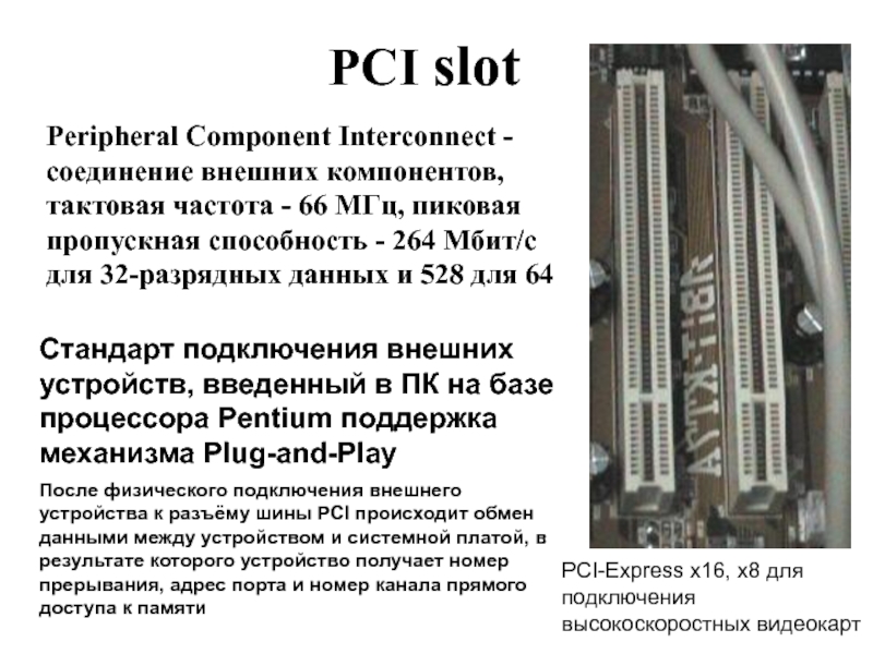 подключение новых устройств через стандартные слоты. Пропускная способность составляет до 5,5 Мбайт/с. В современных компьютерах может использоваться лишь для подсоединения внешних устройств, которые не требуют большей пропускной способности (звуковые карты, модемы и т.д.).