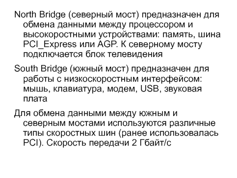 Слайд 89North Bridge (северный мост) предназначен для обмена данными между процессором