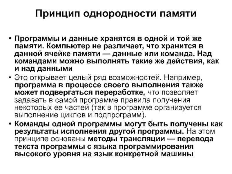Команды одной программы могут быть получены как результаты исполнения другой программы. На этом принципе основаны методы трансляции — перевода текста программы с языка программирования высокого уровня на язык конкретной машины