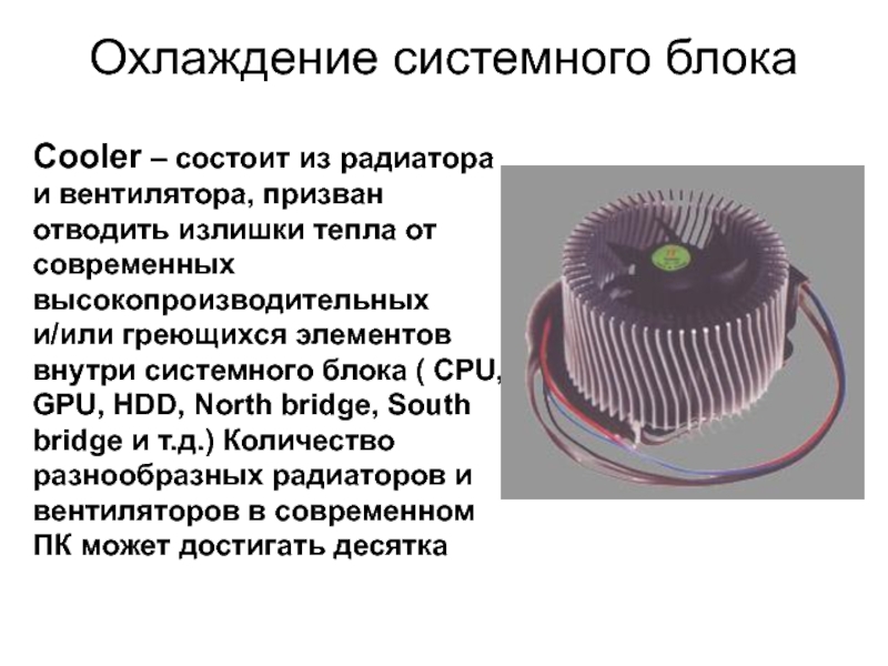 Система охлаждения предполагает нагнетание воздуха в системный блок, а вентилятор источника питания и дополнительные вентиляторы выдувают воздух из корпуса