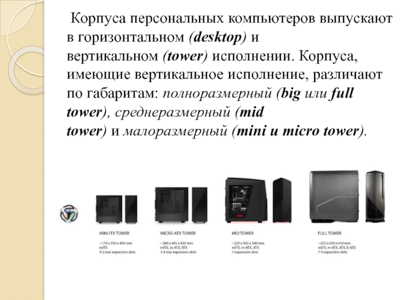 Слайд 4 Корпуса персональных компьютеров выпускают в горизонтальном (desktop) и вертикальном (tower) исполнении. Корпуса, имеющие вертикальное
