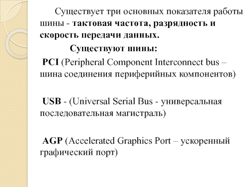 Слайд 18 Существует три основных показателя работы шины - тактовая частота, разрядность