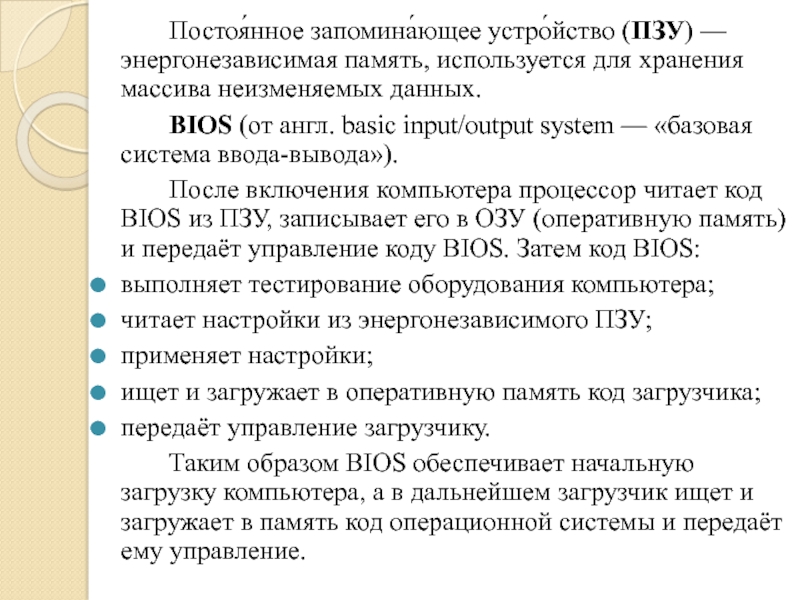 Слайд 10 Постоя́нное запомина́ющее устро́йство (ПЗУ) —энергонезависимая память, используется для хранения массива неизменяемых данных.