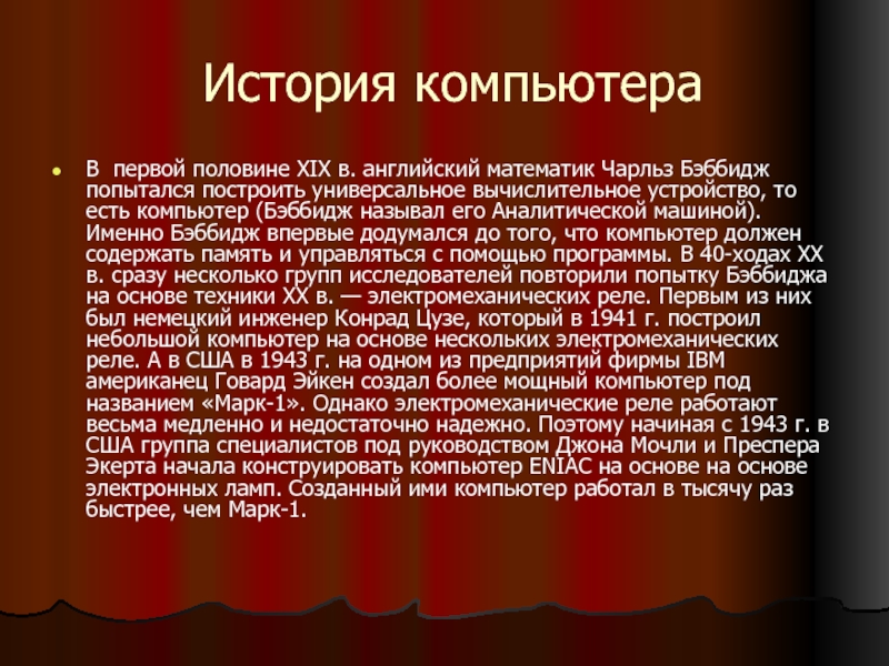 называл его Аналитической машиной). Именно Бэббидж впервые додумался до того, что компьютер должен содержать память и управляться с помощью программы. В 40-ходах XX в. сразу несколько групп исследователей повторили попытку Бэббиджа на основе техники XX в. — электромеханических реле. Первым из них был немецкий инженер Конрад Цузе, который в 1941 г. построил небольшой компьютер на основе нескольких электромеханических реле. А в США в 1943 г. на одном из предприятий фирмы IBM американец Говард Эйкен создал более мощный компьютер под названием «Марк-1». Однако электромеханические реле работают весьма медленно и недостаточно надежно. Поэтому начиная с 1943 г. в США группа специалистов под руководством Джона Мочли и Преспера Экерта начала конструировать компьютер ENIAC на основе на основе электронных ламп. Созданный ими компьютер работал в тысячу раз быстрее, чем Марк-1.