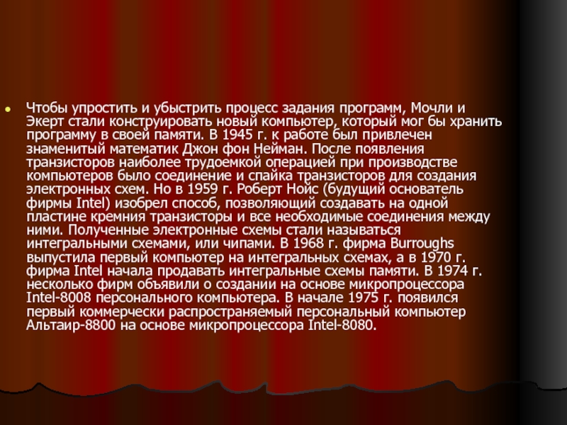 своей памяти. В 1945 г. к работе был привлечен знаменитый математик Джон фон Нейман. После появления транзисторов наиболее трудоемкой операцией при производстве компьютеров было соединение и спайка транзисторов для создания электронных схем. Но в 1959 г. Роберт Нойс (будущий основатель фирмы Intel) изобрел способ, позволяющий создавать на одной пластине кремния транзисторы и все необходимые соединения между ними. Полученные электронные схемы стали называться интегральными схемами, или чипами. В 1968 г. фирма Burroughs выпустила первый компьютер на интегральных схемах, а в 1970 г. фирма Intel начала продавать интегральные схемы памяти. В 1974 г. несколько фирм объявили о создании на основе микропроцессора Intel-8008 персонального компьютера. В начале 1975 г. появился первый коммерчески распространяемый персональный компьютер Альтаир-8800 на основе микропроцессора Intel-8080.