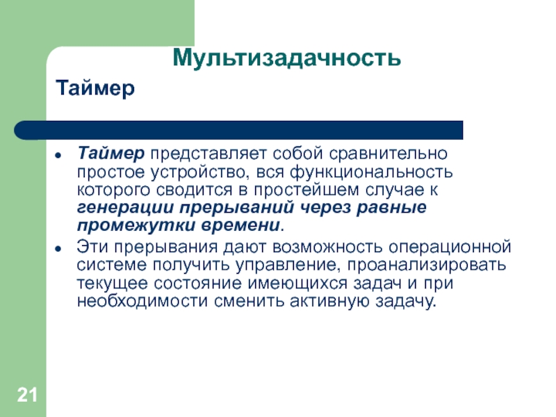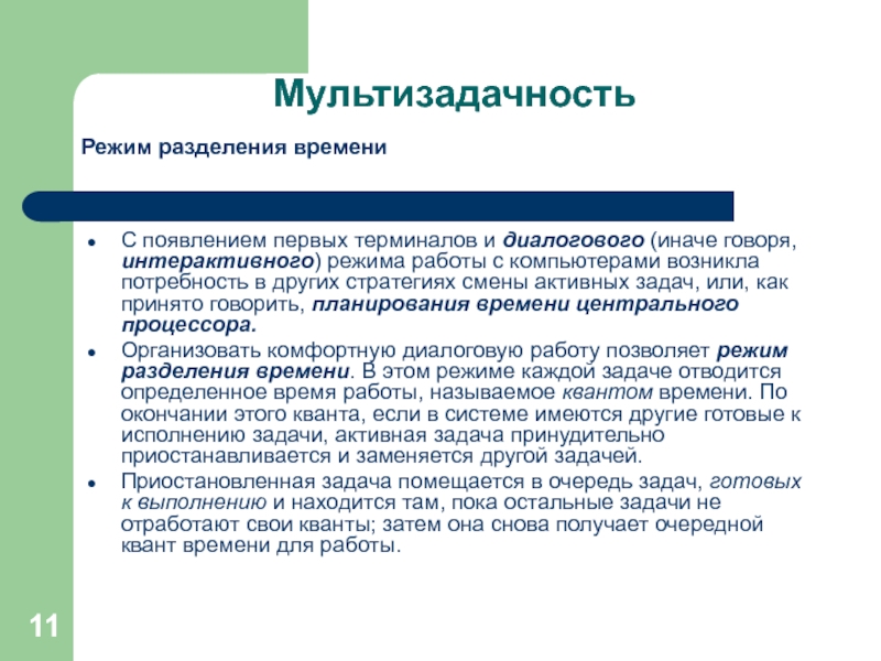 Организовать комфортную диалоговую работу позволяет режим разделения времени. В этом режиме каждой задаче отводится определенное время работы, называемое квантом времени. По окончании этого кванта, если в системе имеются другие готовые к исполнению задачи, активная задача принудительно приостанавливается и заменяется другой задачей.
