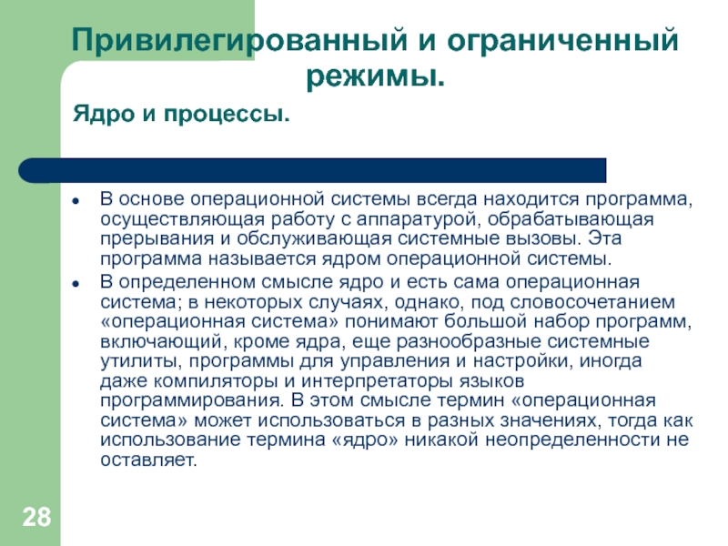 программы, вне зависимости от уровня их полномочий, выполняются в ограниченном режиме в виде процессов, а все действия, выходящие за рамки преобразования данных в отведенной им памяти, выполняют путем обращения к ядру с помощью системных вызовов.
