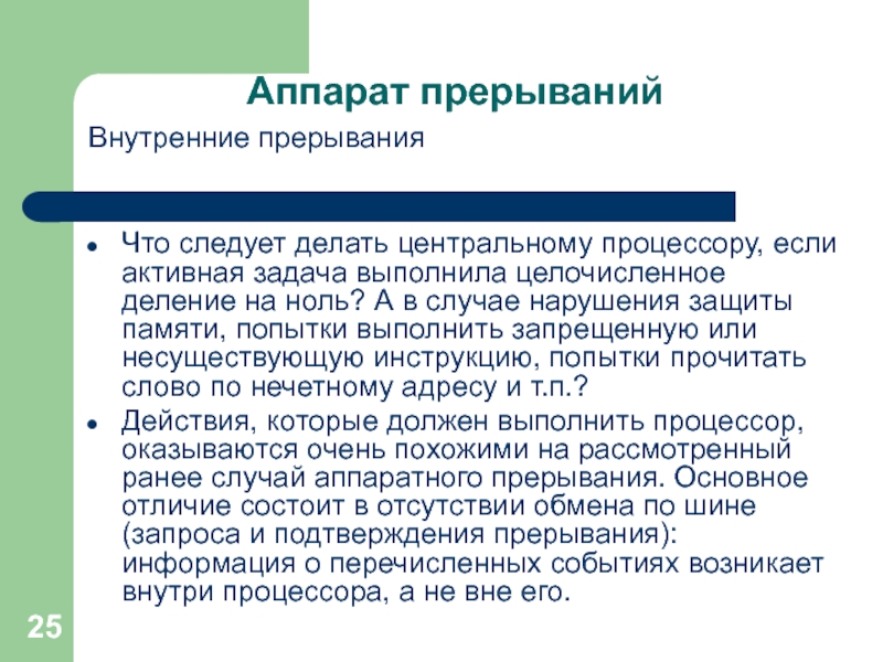 называют так же, как и действия по запросу внешних устройств − прерываниями. Чтобы не путать разные по своей природе прерывания, их делят на внешние (аппаратные) и внутренние; такая терминология оправдана тем, что причина внешнего прерывания находится вне центрального процессора, тогда как причина внутреннего − у ЦП внутри.