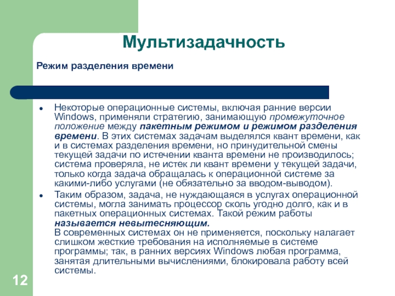 времени. В этих системах задачам выделялся квант времени, как и в системах разделения времени, но принудительной смены текущей задачи по истечении кванта времени не производилось; система проверяла, не истек ли квант времени у текущей задачи, только когда задача обращалась к операционной системе за какими-либо услугами (не обязательно за вводом-выводом).