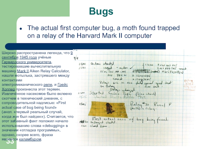 что 9 сентября 1945 года учёные Гарвардского университета, тестировавшие вычислительную машину Mark II Aiken Relay Calculator, нашли мотылька, застрявшего между контактами электромеханического реле, и Грейс Хоппер произнесла этот термин. Извлечённое насекомое было вклеено скотчем в технический дневник, с сопроводительной надписью: «First actual case of bug being found» (англ. «первый реальный случай, когда жук был найден»). Считается, что этот забавный факт положил начало использованию слова «debugging» в значении «отладка программы», однако, скорее всего, фраза является каламбуром.