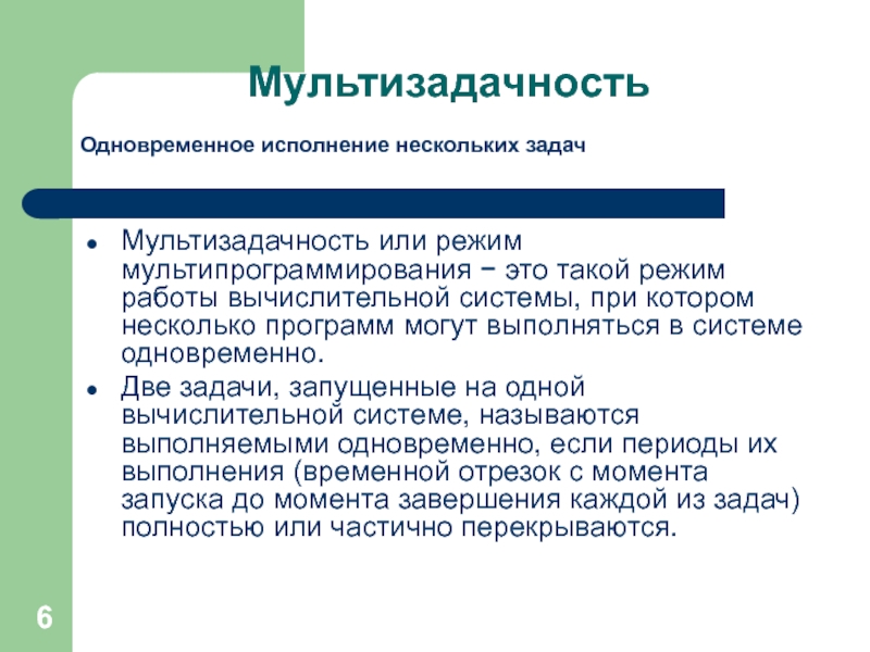 Две задачи, запущенные на одной вычислительной системе, называются выполняемыми одновременно, если периоды их выполнения (временной отрезок с момента запуска до момента завершения каждой из задач) полностью или частично перекрываются.